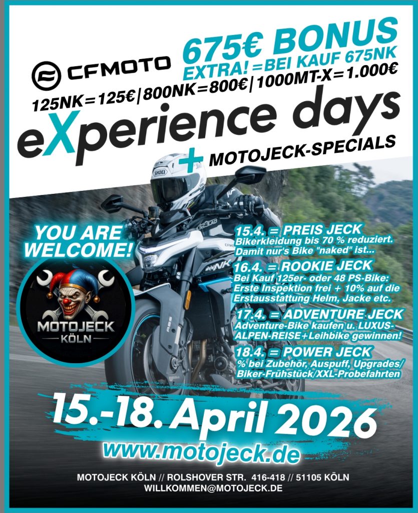 Die „eXperience days“ rund um CFMOTO starten! Vom 15.4.2026 bis 18.4.2026 gibt’s bei MOTOJECK ganz viele starke Angebote – und teils wirklich sentationelle Bike-Konditionen mit wertigen Goodies obendrauf. Wer immer schon wollte – JETZT ist die Gelegenheit da. Andere können aber auch einfach eine Menge entdecken. KURZ: Bleibt auf dem Sender, schaut öfter rein – hier und bei uns im Shop. Da kommt einiges, versprochen. Und etliche Angebote sind echte eXperience-Sonderkonditionen – und gelten wirklich nur an diesen vier Tagen…