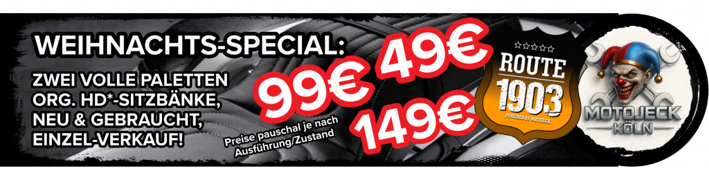 Wir räumen unser Lager! Und schaffen Platz für neue Ware. Mit dabei: Ungefähr 50-60 originale HD-Sitzbänke für ganz unterschiedliche Modelle – auch oder gerade etwas älterer Baujahre. Sind meist in einem guten bis neuwertigen Zustand, teils Austauschstücke von damaligen Neumaschinen. Die nach Listenpreis meist mehrere hundert Euro teuren Bänke gibt’s bei uns einfach zu Pauschaltarifen: 49,- Euro für leicht beschädigte oder mit Aufdruck (für individuelle Projekte, wo eh neu bezogen wird), 99,- Euro für komplett originale und neuwertige Serien-Sitze (z.B. als Ersatz), 149,- Euro für neuwertige Bänke als handwerkliche Sattlerarbeit mit teils „extravaganten Bezügen“ (bisher unverbaut aus Custom-Projekten). Einfach vorbeikommen, selbst (r)aussuchen, von der Palette kaufen, mitnehmen! Eine wirklich einmalige Gelegenheit in dieser Fülle und zu diesem Preis. Dafür keinerlei Garantie (auch nicht für’s „passen“), kein Umtausch, keine Rücknahme. Das gute alte „gekauft wie gesehen“ greift. Erster Verkaufstag bei MOTOJECK im Shop: das Open-House am Samstag, 6. Dezember 2025, siehe oben.