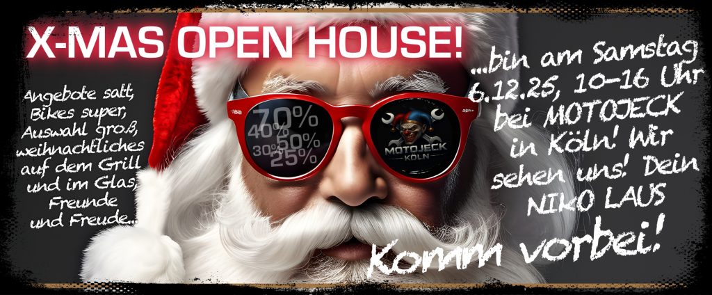Wer uns und unsere Angebote kennt, wird gerne beim Jahresend-Open-House dabei sein. Und wer uns kennenlernen möchte, hat hier DIE Gelegenheit. Was euch erwartet, steht ausführlich in den einzelnen Artikeln in diesem Newsletter: Viele starke Angebote und Nachlässe, eine Riesenauswahl an erhältlichen Demo- und Vorführbikes, die wir zu starken Preisen aktuell abgeben und, und, und. Dazu gibt’s natürlich eine weihnachtliche Bewirtung, süsse Leckereien, die berühmte X-Mas-Bratwurst und nette Benzingespräche. Wir meinen: Direkt den Termin schon einmal in den Kalender fett eintragen – es lohnt sich. HERZLICH WILLKOMMEN!